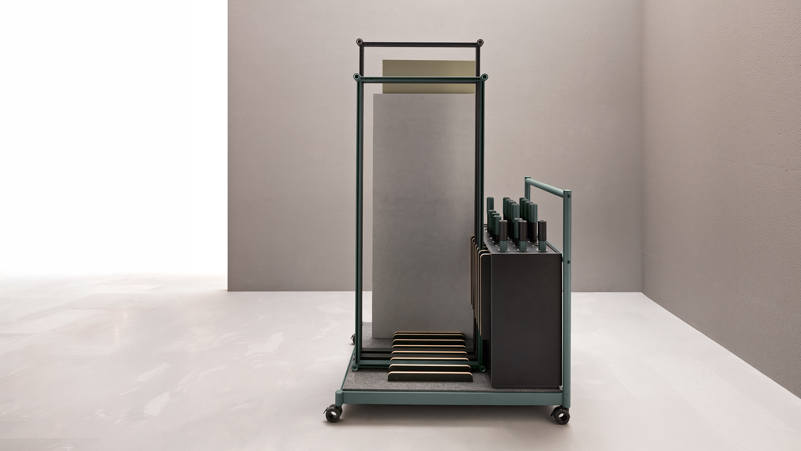 Fluido® est né de l’idée des comptoirs de vente de poissons de Venise, où chaque jour, en fonction de la pêche, les bacs deviennent interchangeables et facilement remplaçables; le tout soutenu par une structure qui peut être assemblée et réutilisée ailleurs. De cette vision naît Fluido®, une structure facile à assembler et désinstaller, complétée par une série d’éléments tels que des plateaux, des bacs, des tiroirs, qui rendent le produit absolument customisable selon sa fonction; avec les mêmes éléments, il est possible de créer des tables basses et hautes, des chariots de différentes tailles, des bibliothèques et bien plus encore.