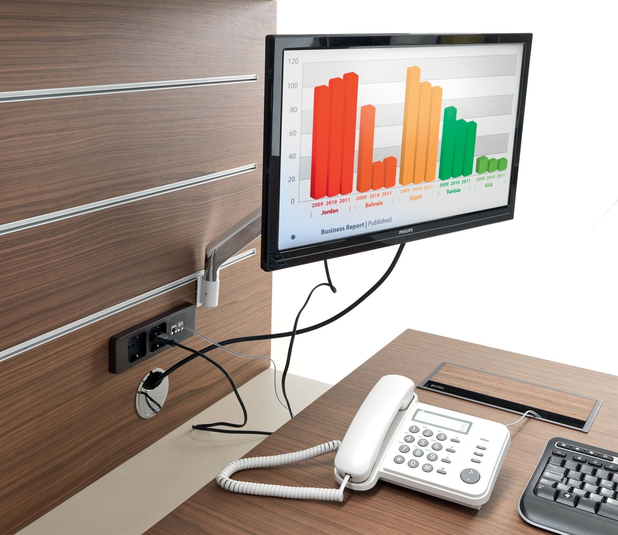 | Électrification | Différentes options pour l'électrification des bureaux et des tables de réunion, par exemple différents top access, prises plug-in, flippers et flip-tops. La rémonté du câble est effectuée par la vertèbre u solutions intégrées dans les piètements des tables de réunion. |
