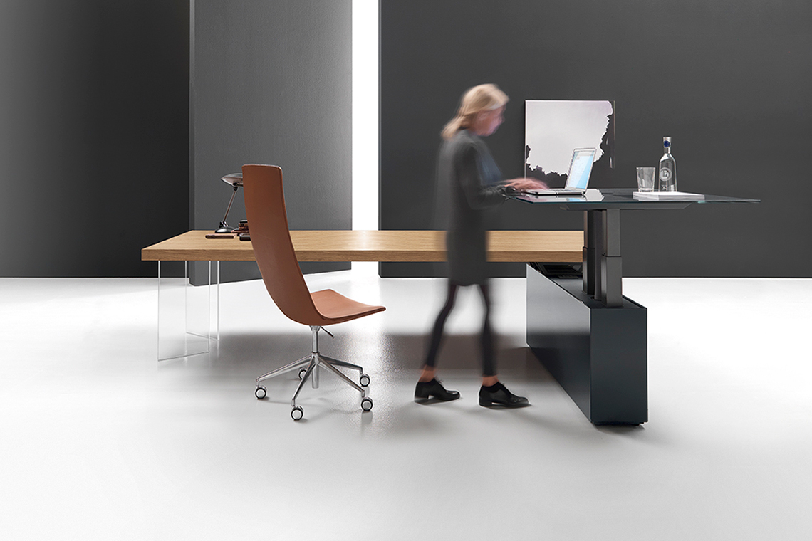 Le plateau réglable en hauteur de Kyo peut être utilisé comme surface de travail ou comme plan de réunion pour accueillir les visiteurs.