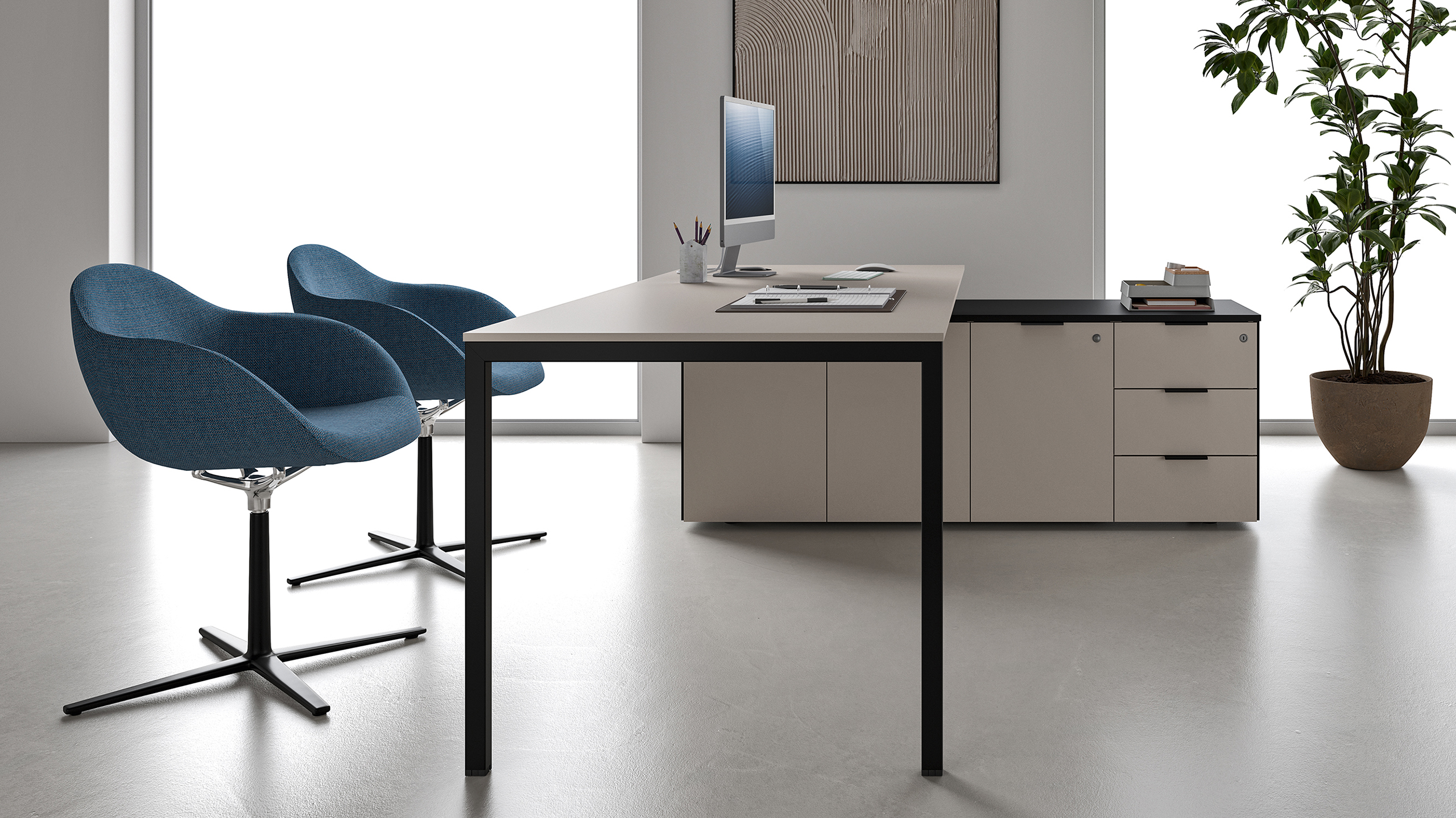 Agile è un programma di scrivanie manageriali, bench e tavoli riunione dalle linee semplici e geometriche arricchite dalla possibilità di scelta tra due tipologie di spessori dei piani, 14 o 30 mm, e dalla varietà delle finiture della gamba.
