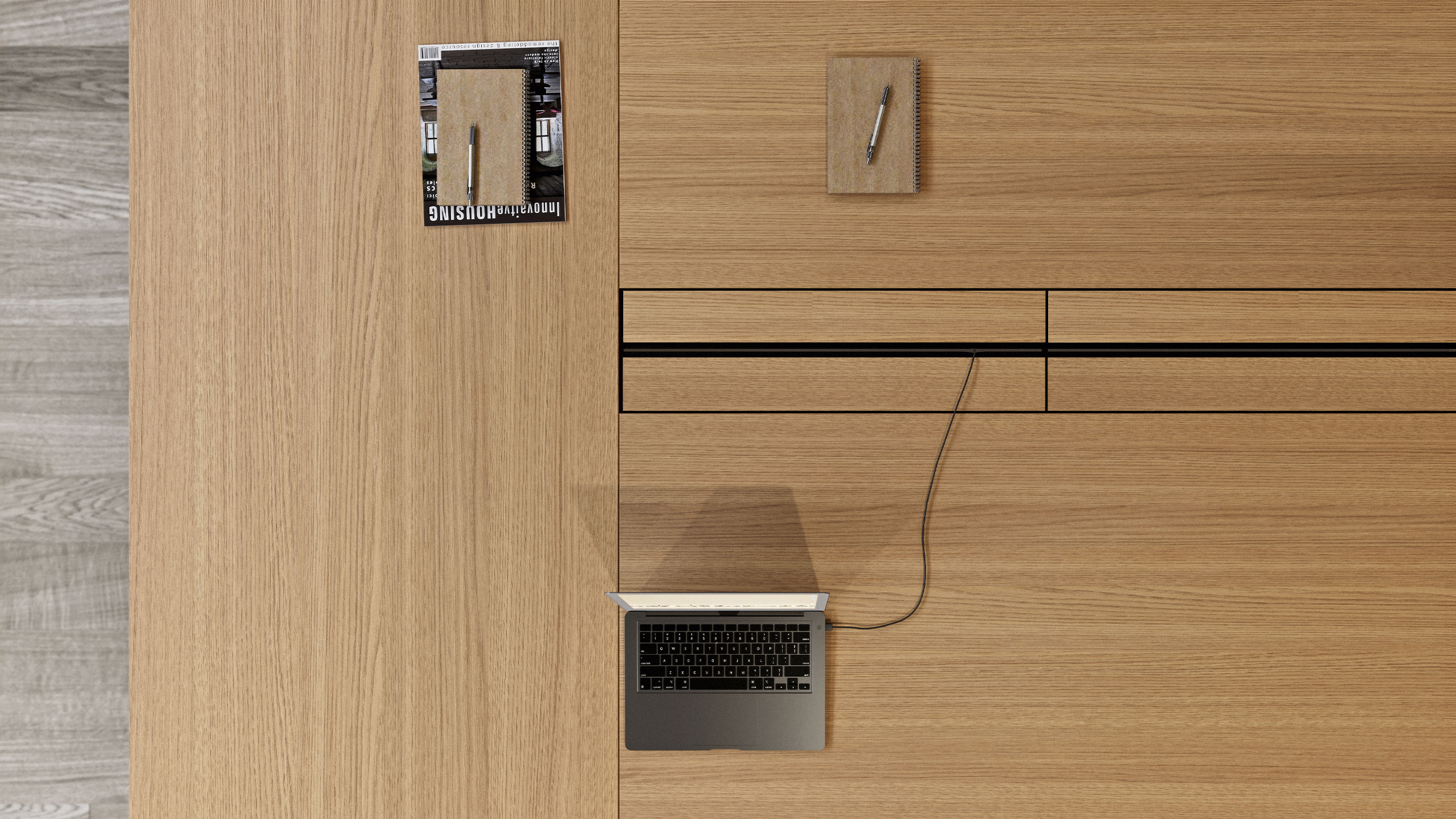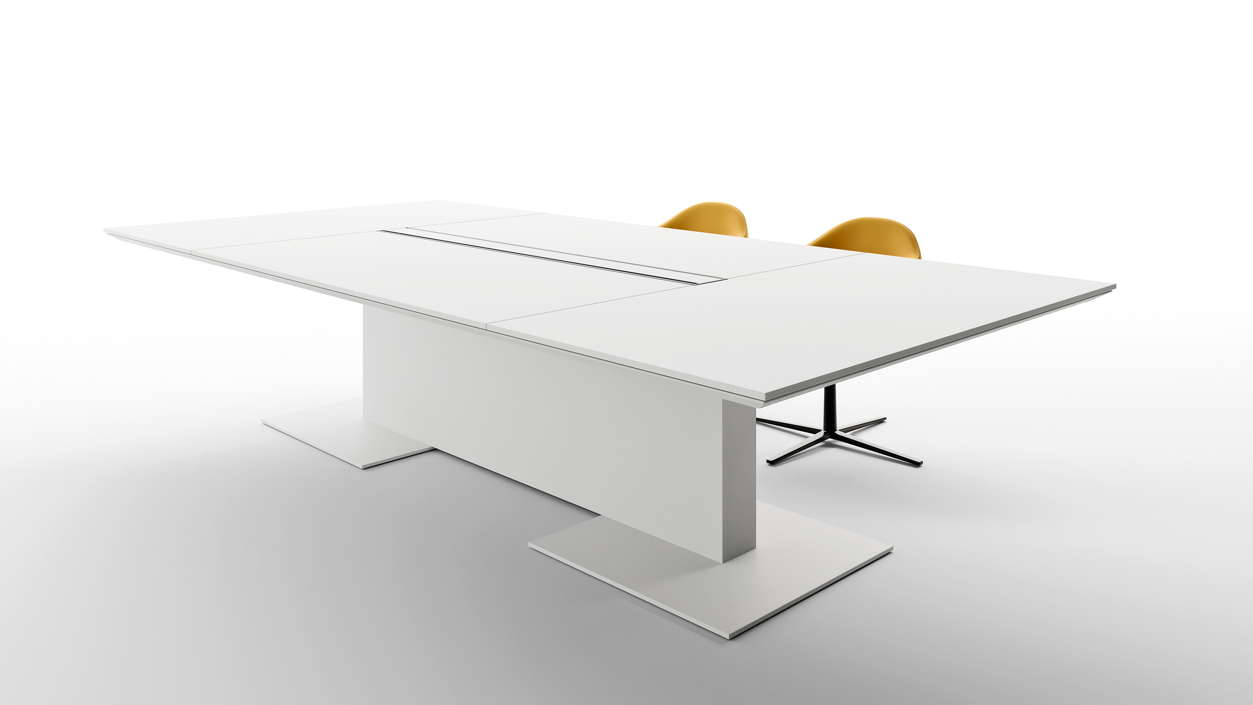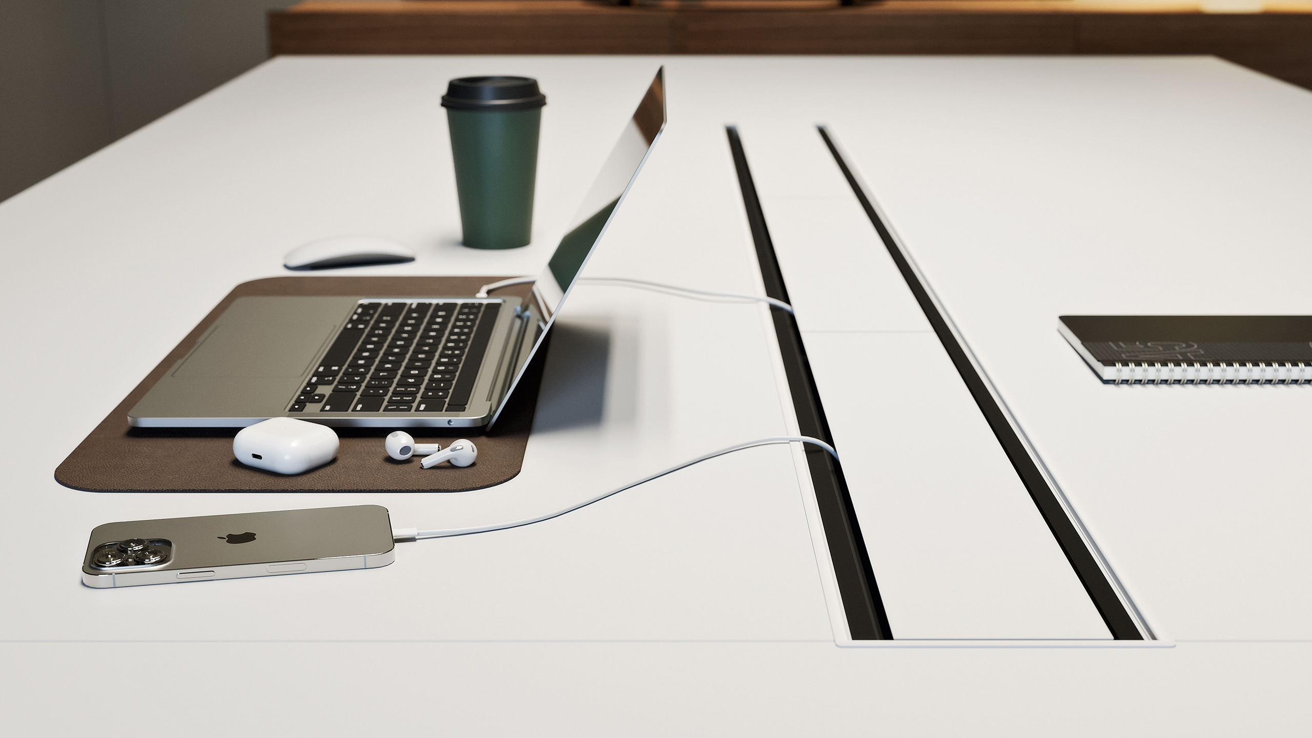 | Elettrificazione | Diverse opzioni per l'elettrificazione dei piani scrivania e dei tavoli riunione, ad esempio diversi passacavi, prese plug-in, flipper e flip top. La salita cavi avviene tramite vertebra nella gamba singola oppure tramite gamba centrale elettrificata nei tavoli riunione. |