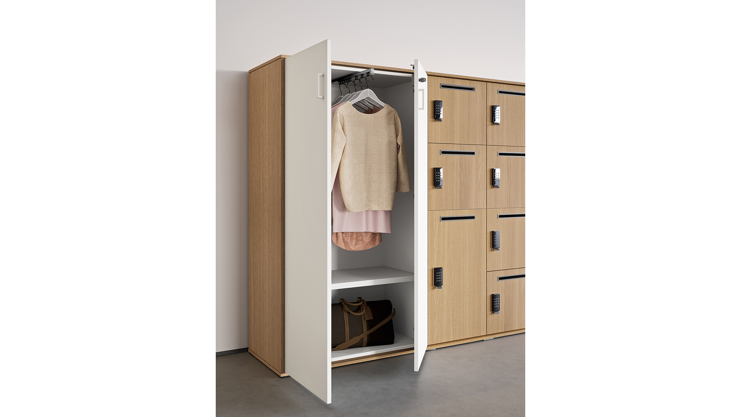 A completamento, moduli appendiabiti e vani a giorno rendono il sistema più flessibile, ideale per spogliatoi, aree reception o open space aziendali.