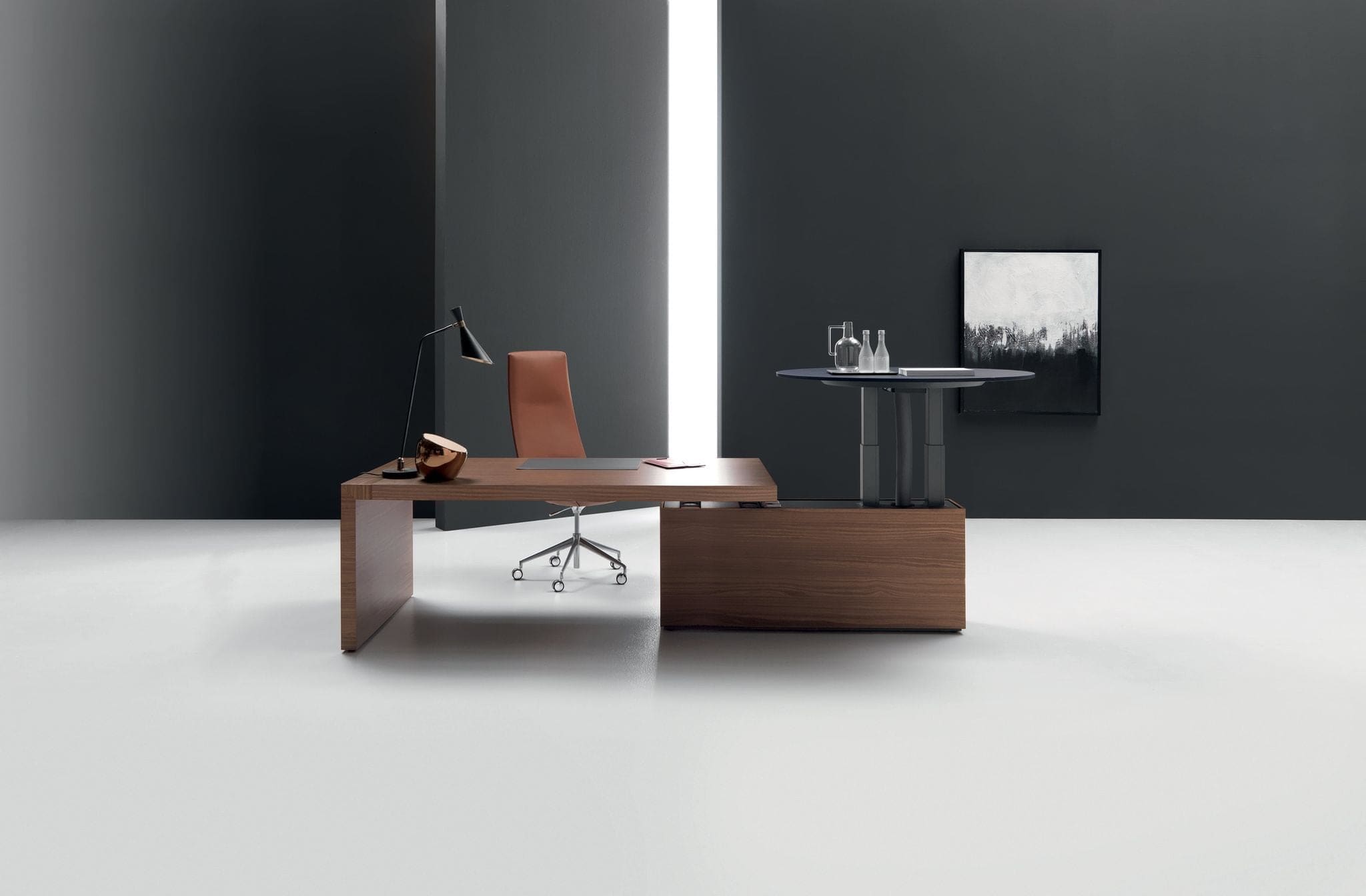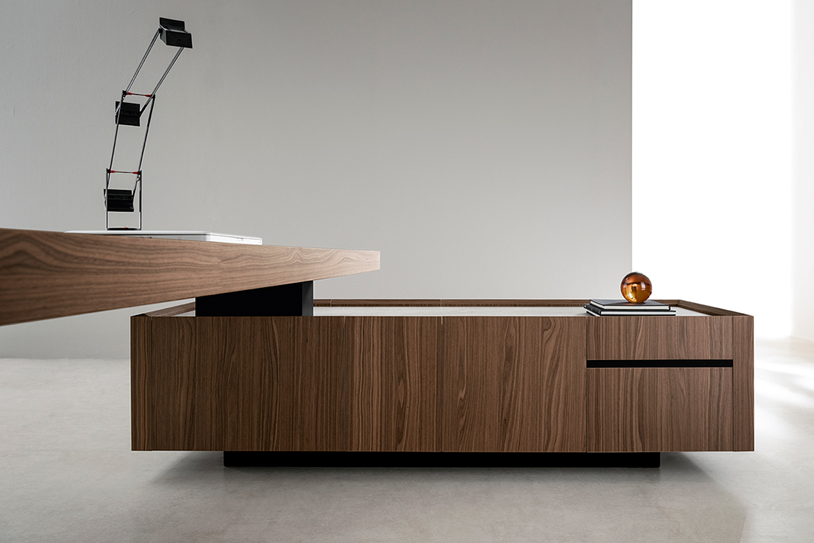 Kyo da giapponese “forza” è un sistema di scrivanie direzionali, presidenziali e di meeting dove le forme semplici del tratto sono esaltate dall’uso dei materiali e dal forte spessore dei piani.