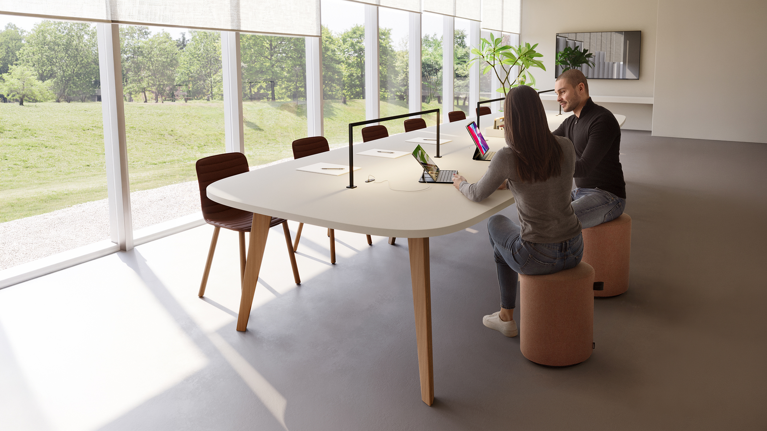 Struttura metallica con trave centrale autoportante fino a 3600 mm senza supporti intermedi, per una postazione elegante e priva di ingombri.