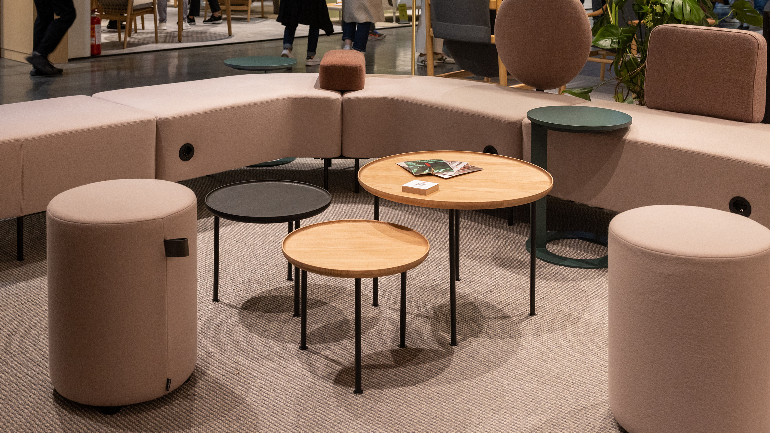La collezione Intorno, invece, esprime un’anima più ricercata e high-end, con piani in pelle o marmo e una varietà di formati, basamenti e altezze, pensata per valorizzare contesti rappresentativi e lounge di alto profilo.