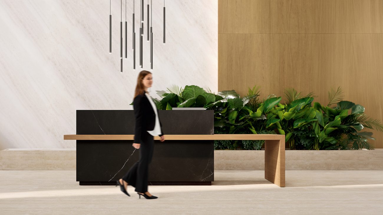 In the metaphor that brings the office closer to the city, the reception becomes the City Gate: the threshold that marks the passage between outside and inside, between public space and corporate identity.