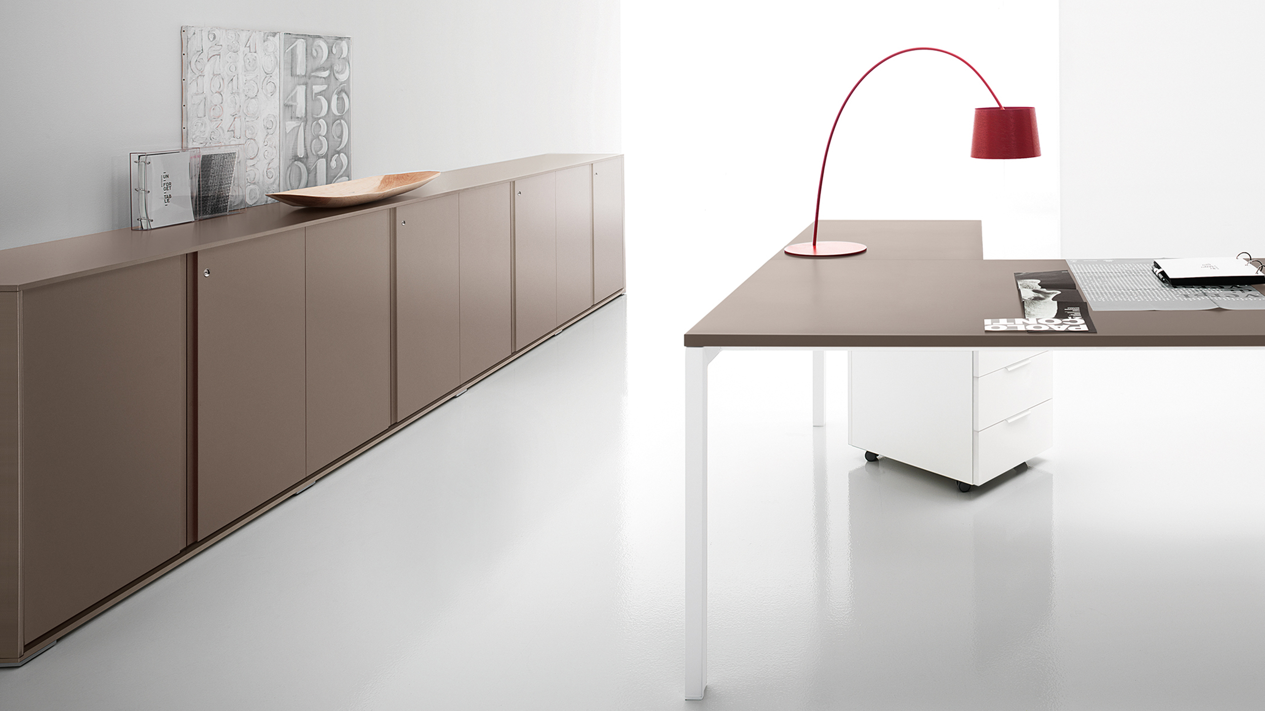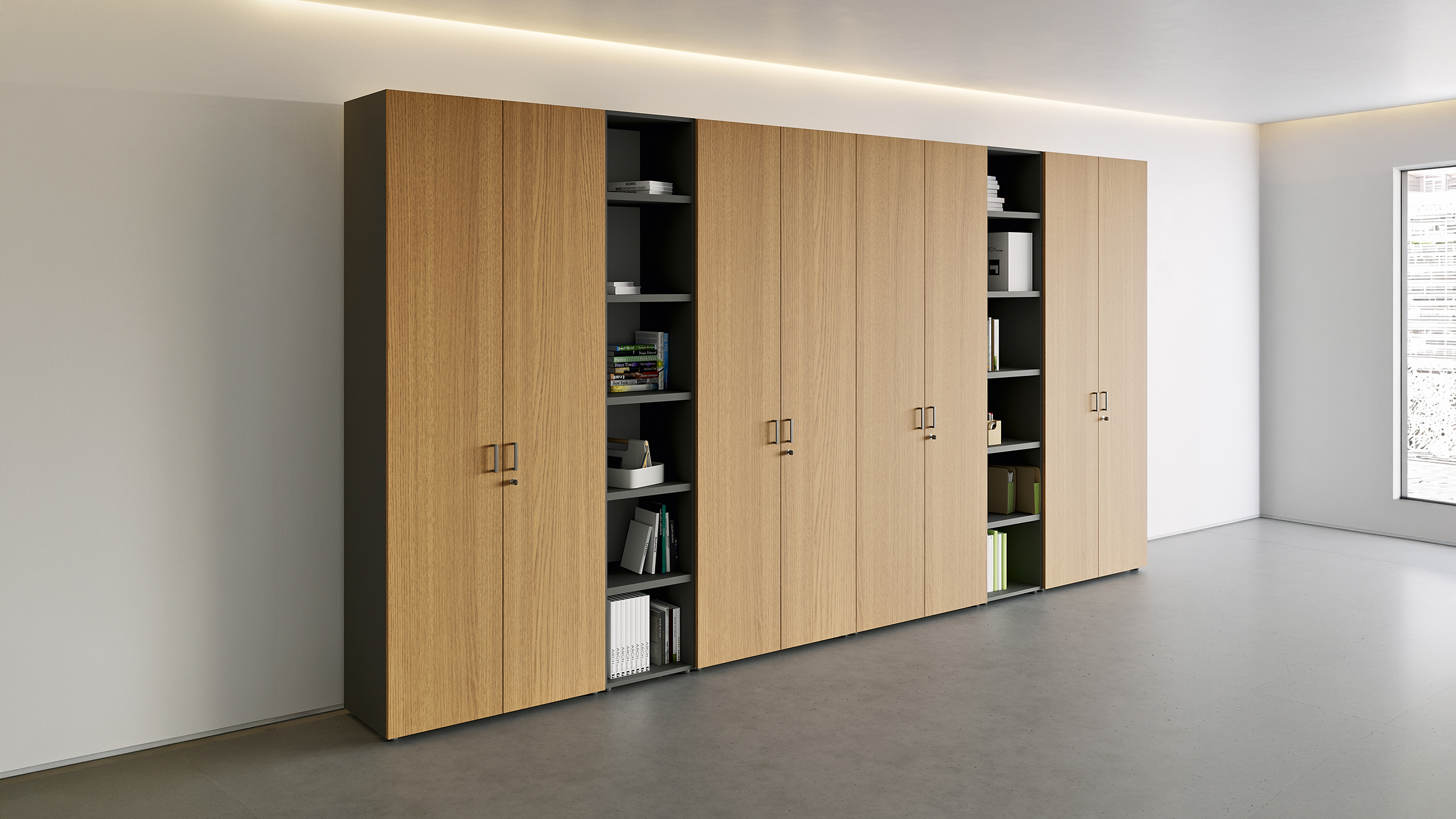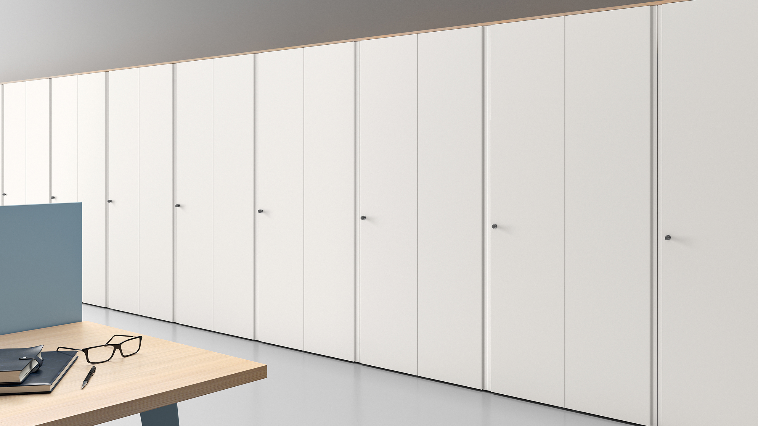 Wall-mounted solutions with push-pull opening add lightness and a refined architectural touch to executive spaces.