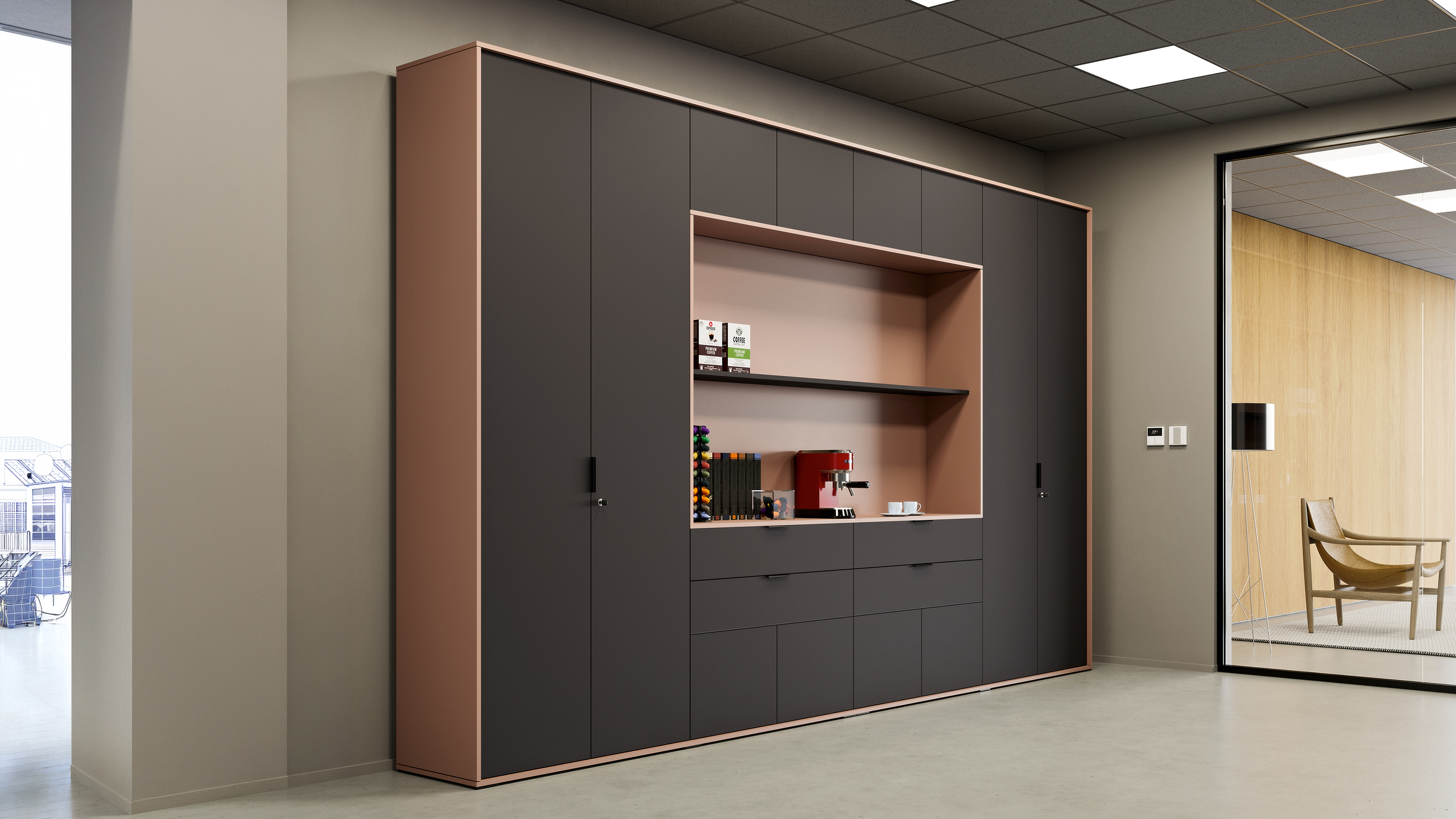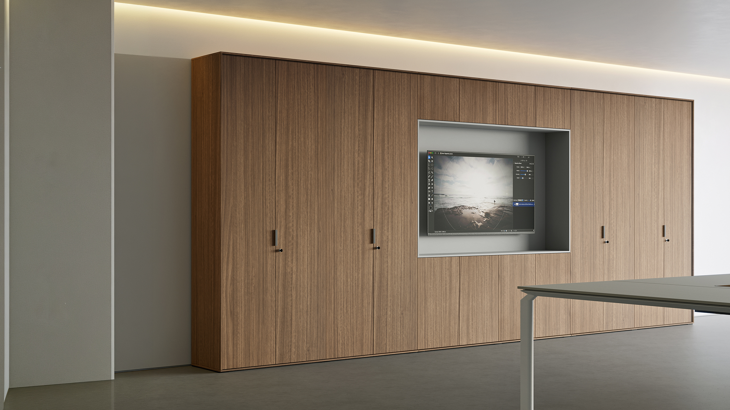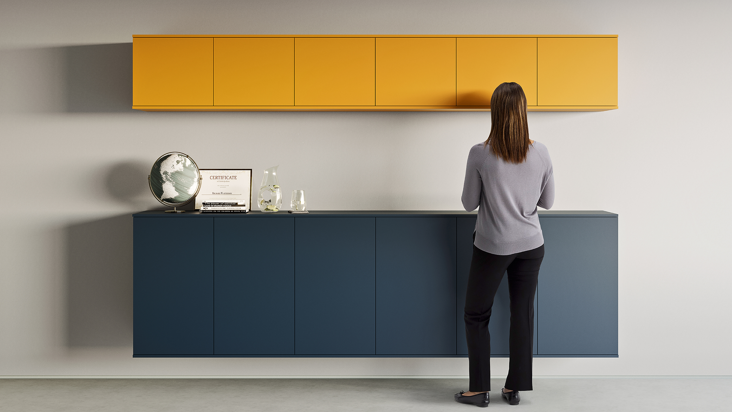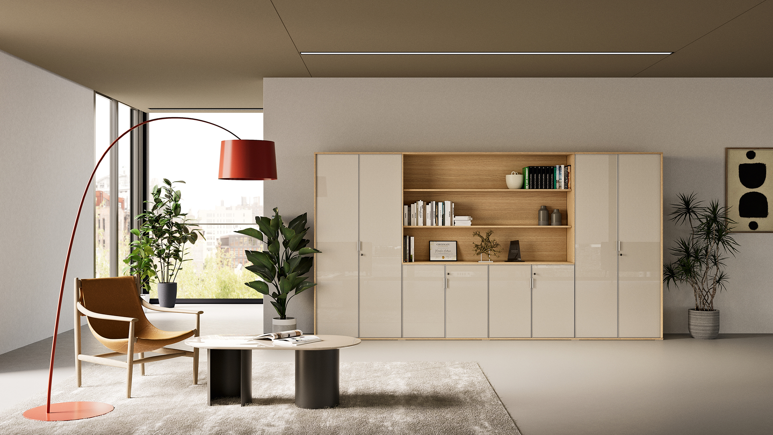 Wall-mounted solutions with push-pull opening add lightness and a refined architectural touch to executive spaces.