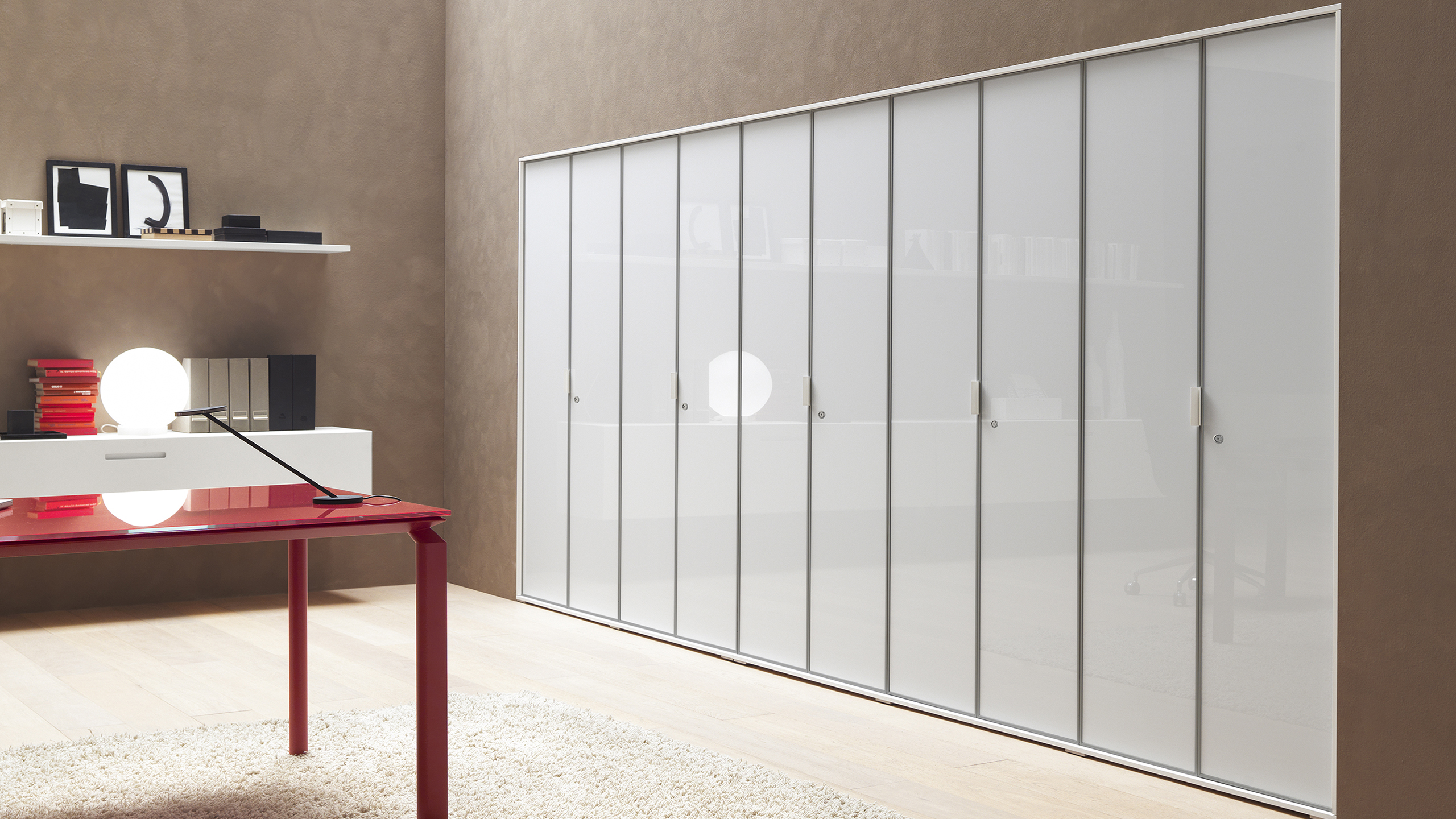 The glass doors — available laquered or transparent — bring brightness and a sense of continuity to the space.