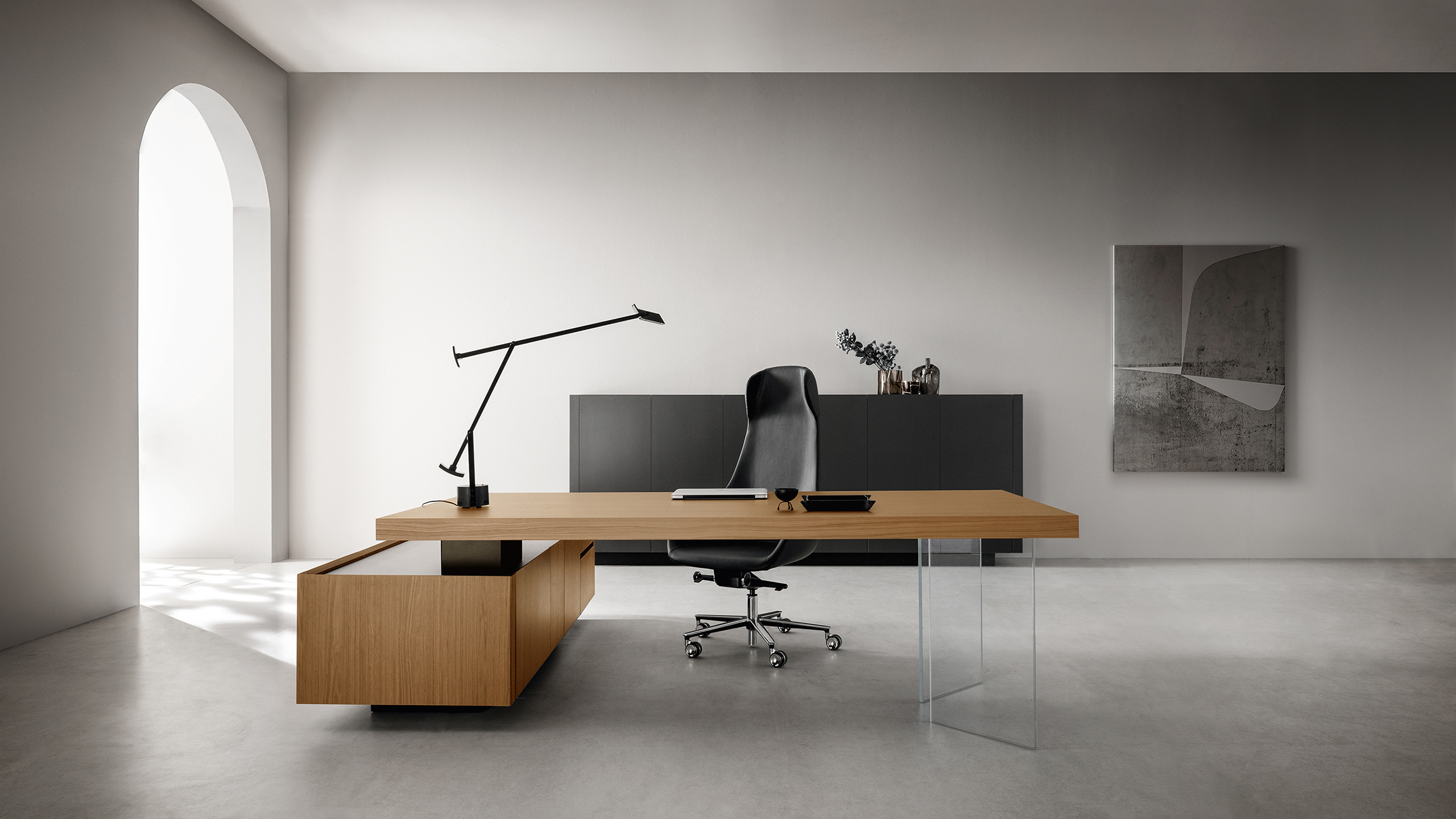 There are many bases to choose from, from wooden legs 70 mm thick in all finishes, under-desk structural cabinets or transparent extra-clear glass basements for a totally suspended desk effect.