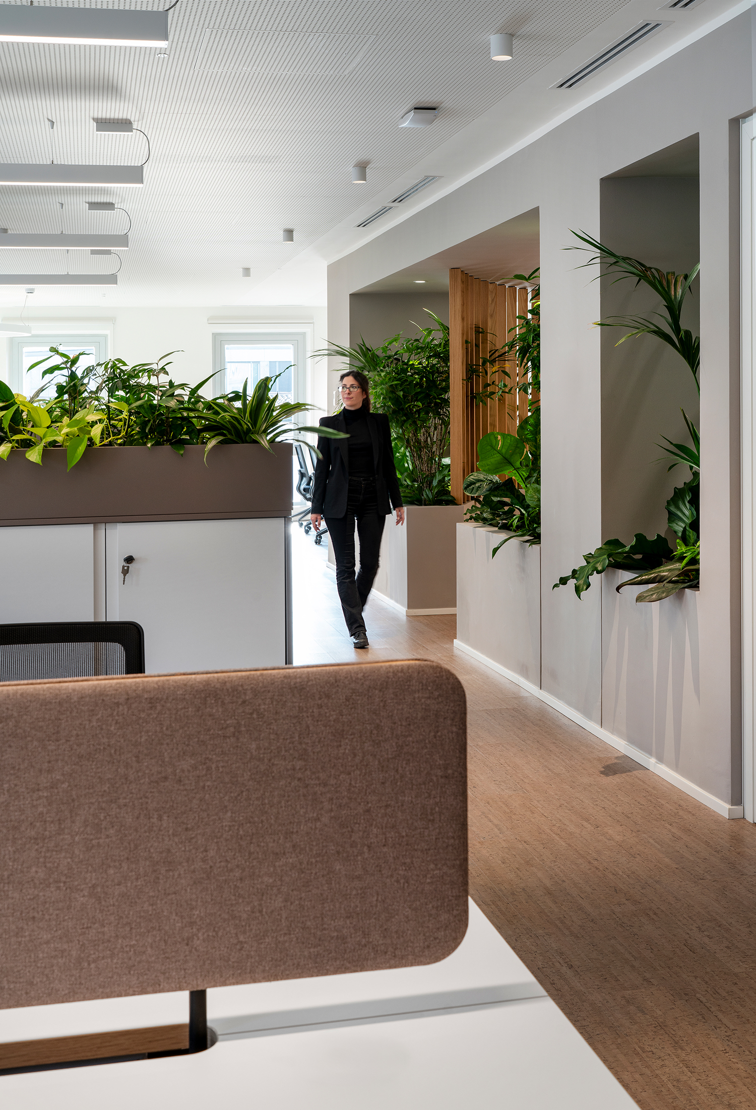 The combination of standard products and custom-made solutions optimizes every square meter, ensuring aesthetic coherence, functionality, and long-term durability, in a project that envisions the office as a living ecosystem in continuous evolution.