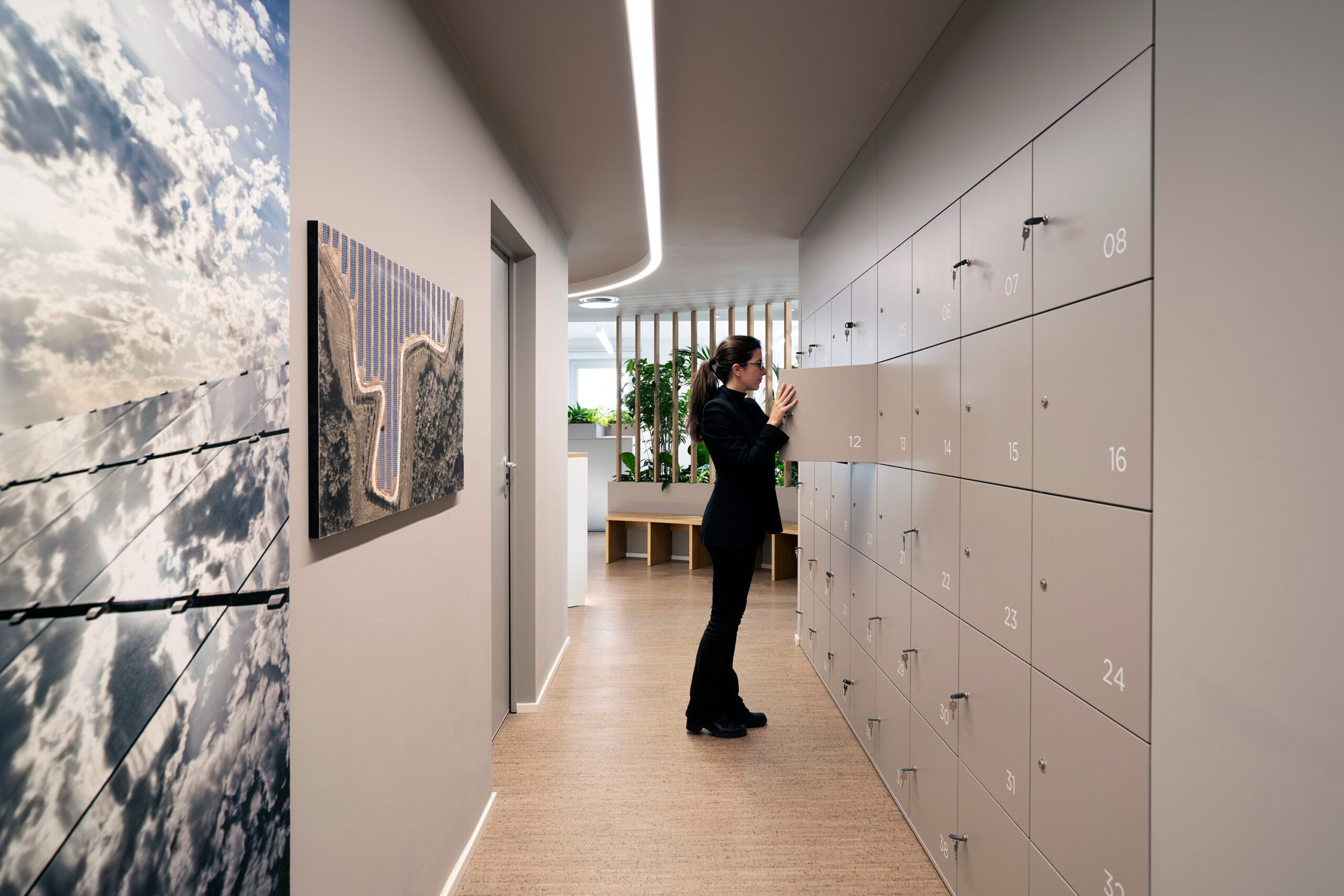 Galaxy storage units, integrated with upper planters, become both functional and architectural elements: they define spaces, enhance visual and acoustic comfort, and host greenery conceived as a true project infrastructure. Lockers complete the system, addressing the organizational needs of a flexible and shared workspace.