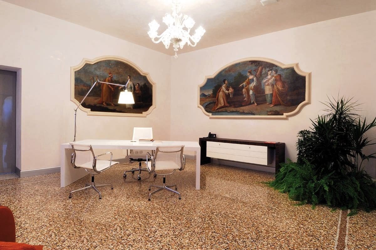 Pordenone Unindustria head office has been furnished with Martex products. Once again Martex created an office environment firstly considering the customer’s needs. The executive office was made using the Kyo presidential collection which, thanks to its thickness and to the finish used, creates a very elegant atmosphere. Meeting rooms and training rooms were furnished with Han, in the operative version. The solution used for desk electrification is functional and practical. Desks finish: Rovere Sbiancato, aluminum and blue lacquered glass.
