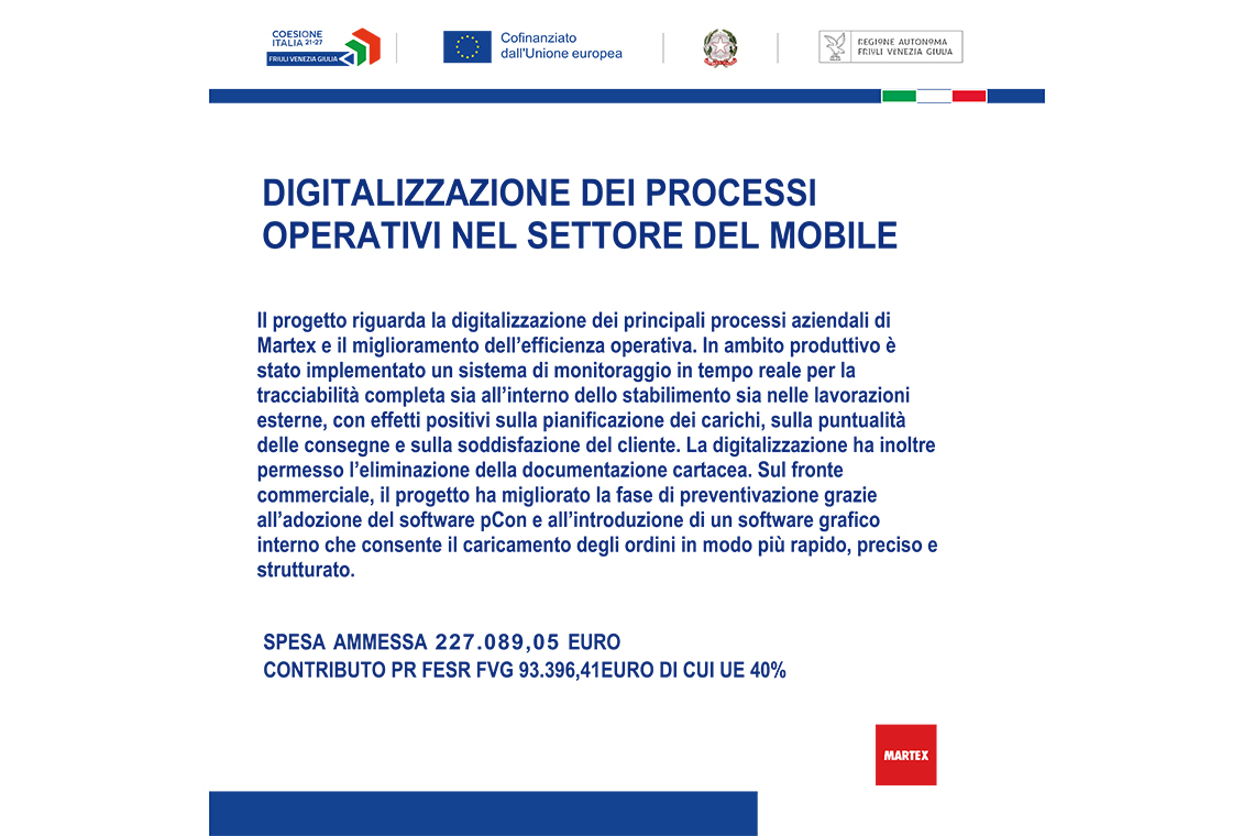 The project focuses on the integrated digitalization of Martex’s production and commercial processes through the implementation of advanced technological solutions aimed at improving operational efficiency, traceability, and the quality of company data.